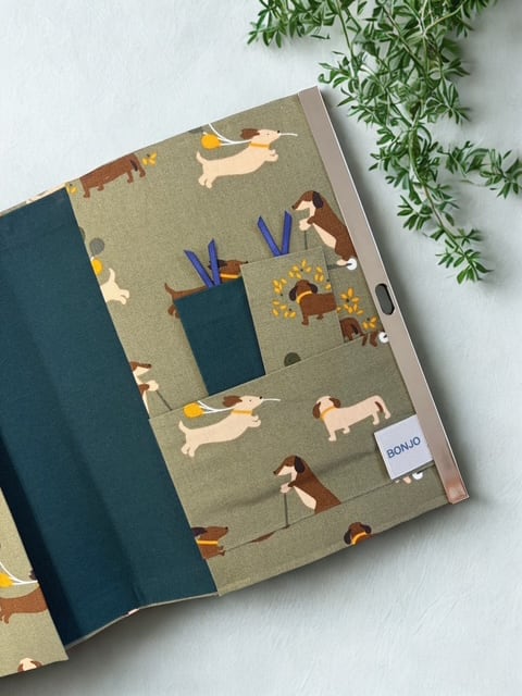 そしてブックカバーを開くと散歩に連れて行きたくなる草原色の裏地が